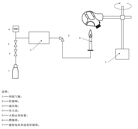 測試原理:將被測試樣佩戴在金屬頭模上,調整金屬頭模高度,使燃燒器頂端與面罩最下端垂直距離為20mm,然后使金屬頭模位于燃燒器燃燒范圍外。點燃燃燒器后,調節燃燒器火焰,使燃燒器火焰高度達到40mm,使距離燃燒器頂端20mm處的火焰溫度達到800℃。啟動金屬頭模運動控制裝置,使被測試樣經過燃燒區,記錄通過火焰上方時面罩材料的燃燒情況。