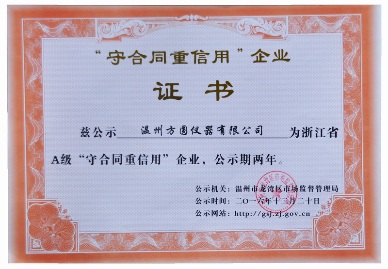 熱烈慶祝溫州方圓儀器有限公司獲得守合同重信譽企業證書